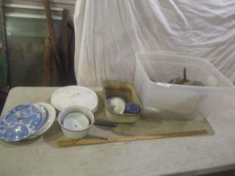 LARGE TOTE OF ENAMEL PANS AND RELATED