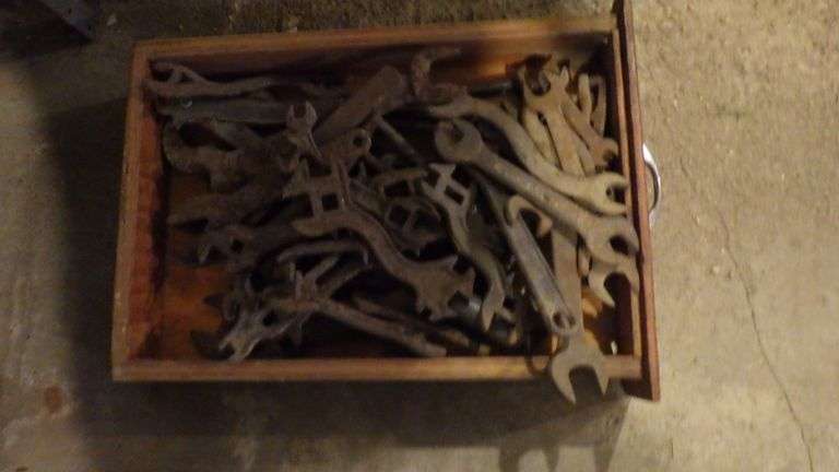 WOODEN DRAWER FULL OF OLD WRENCHES