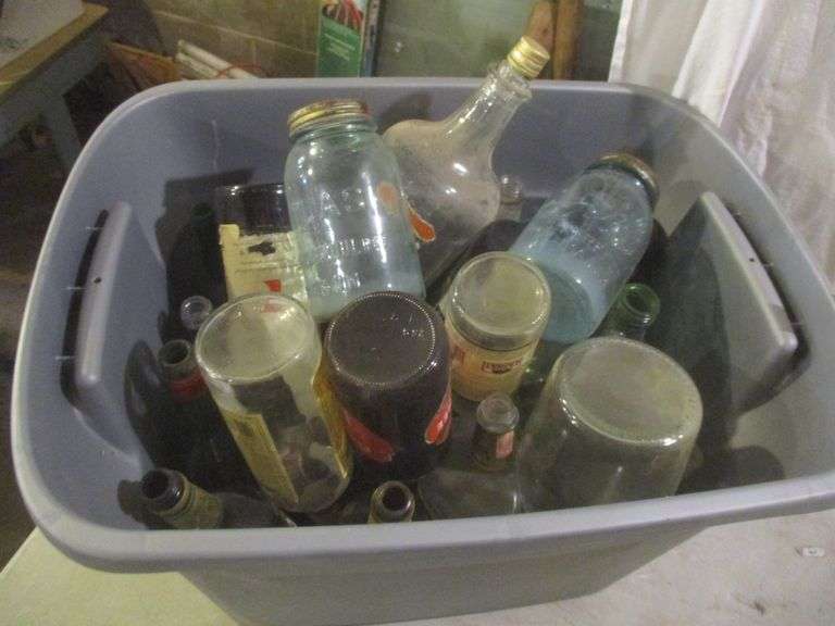 LARGE TOTE OF OLD BOTTLES AND JARS