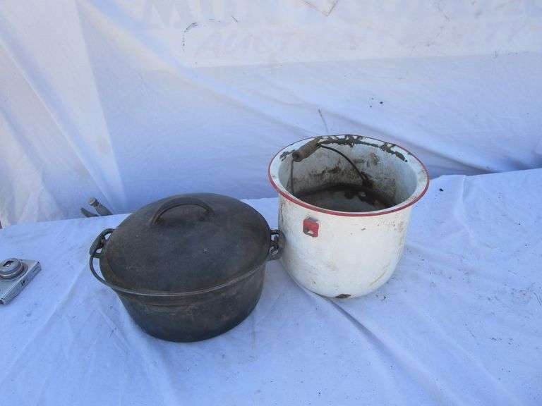ENAMEL POT AND OTHER A ACAST IRON DUTCH OVEN