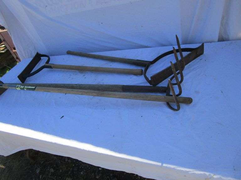 2 VINTAGE WEED WHIPS-OLD FORK AND A GARDEN HOE