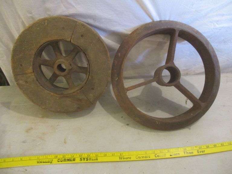 1 WOODEN AND 1 CAST PULLEYS, VINTAGE