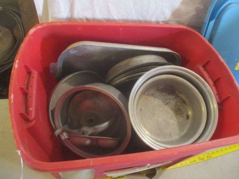 TOTE OF OLD COOKINGPANS, MILKER TOP AND OTHER