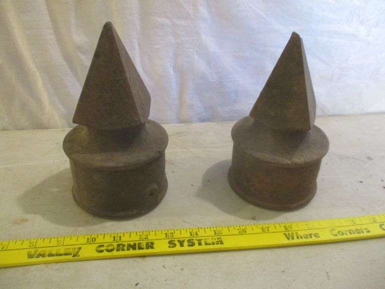 2 VINTAGE CAST IRON GAS STATION POLE TOPS,