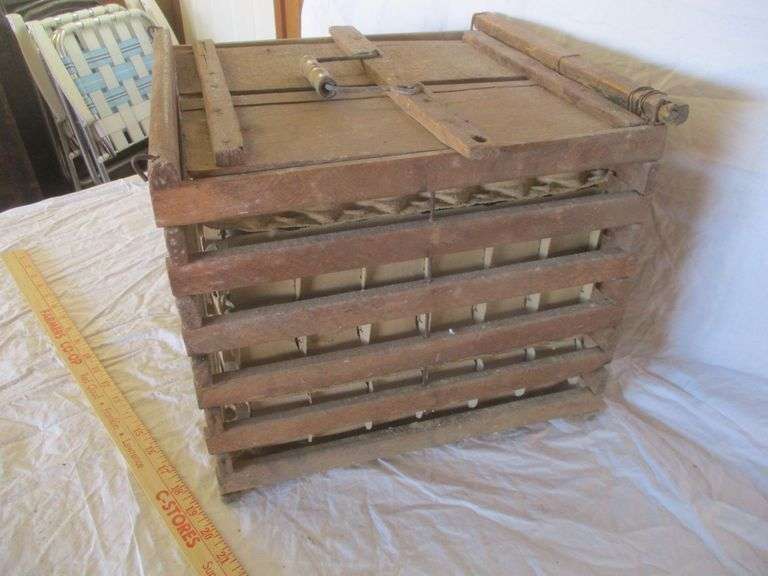 OLD WOODEN EGG CRATE WITH CARDBOAR DIVIDERS