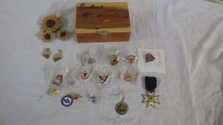 CEDAR BOX WITH ASSORTED LOT OF TIE/COAT PINS