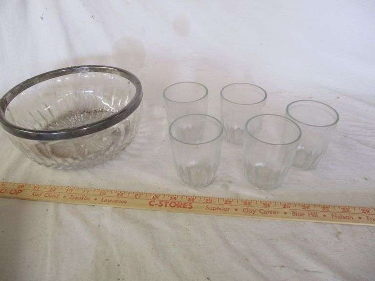 9 INCH GLASS BOWL AND SEVERAL RETRO JELLY GLASSES