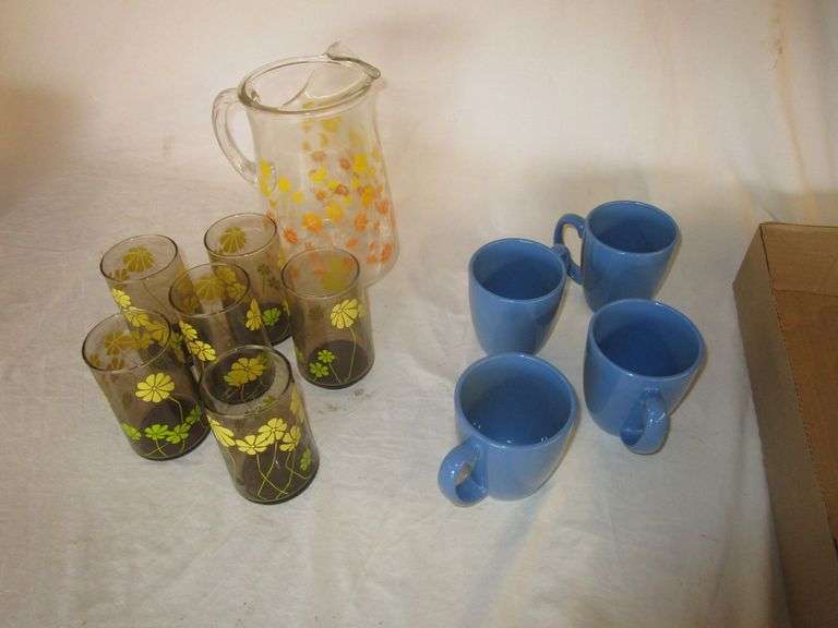 4 CORELL CUPS, RETRO WATER GLASSES & NON MATCHING PITCHER
